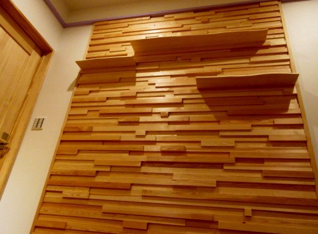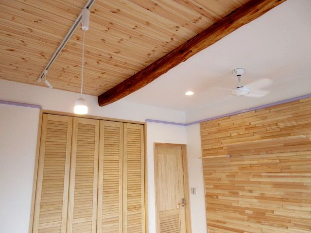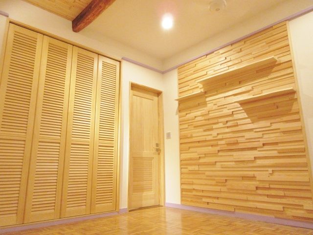 2階のエクステのサロンには、通常は下地に使用する松の垂木を厚みと大きさをさまざまに変えて削り、インパクトのある壁を作りました。クローゼットのルーバー扉とドアはパインの無垢材で、お仕事の道具等を置ける棚は壁のアクセントになっています。