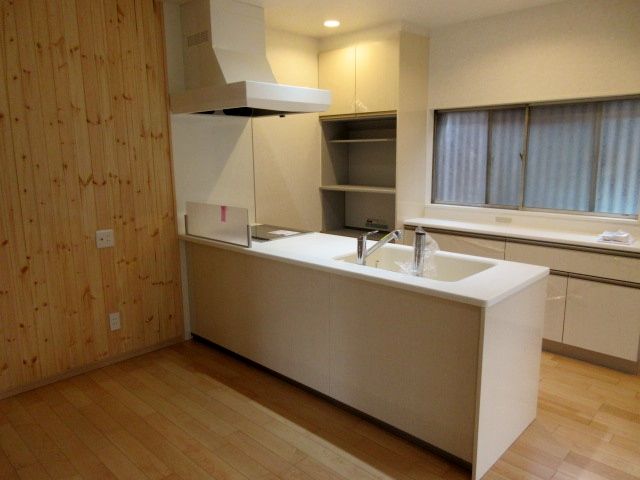 木と白い壁のバランスが爽やかなLDKの対面キッチンは、奥様ご希望の白いレンジフードで、より明るく感じられます。