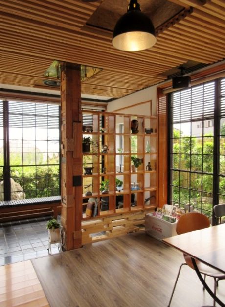 元の天井の上に通常は下地に使う赤松の垂木を3cm幅の棒状にして照明と空調部分をはずして均等に並べて打ち付け、こちらも元々あった檜の棚の側面にけやきの古材を様々な大きさに削り一部を炭で着色したブロックを付けました。大きなガラス窓と床のタイル・窓から見える庭は以前のままで、四季を感じる庭を眺めながらの打ち合わせスペースです。
